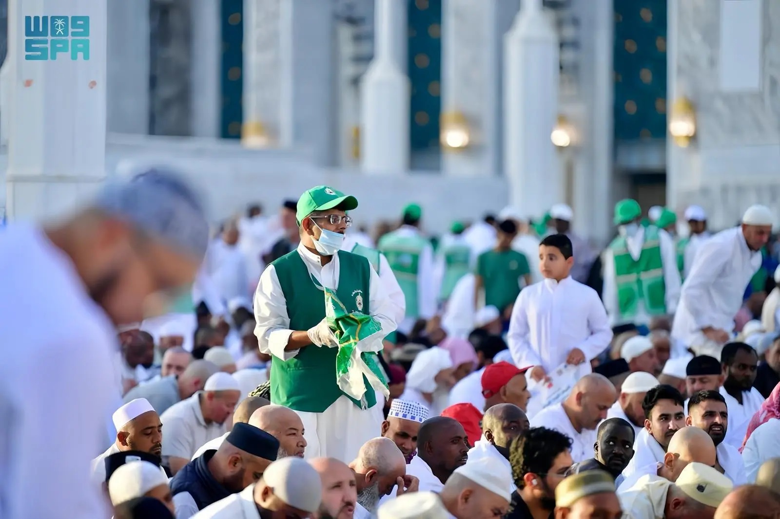 In the courtyards and roads leading to the Grand Mosque, volunteers organize pedestrian flow, direct visitors to designated routes, assist the elderly and people with disabilities, and provide guidance in multiple languages, enhancing smooth movement and reducing congestion during peak times.